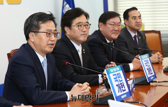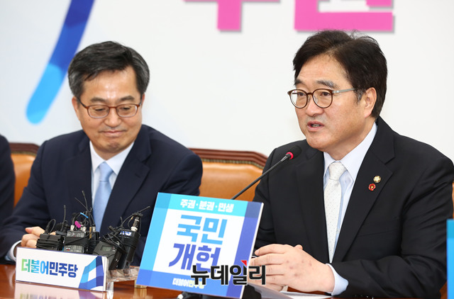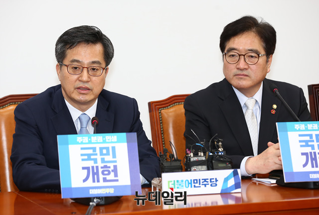 김동연 부총리 겸 기획재정부 장관이 29일 오전 국회에서 우원식 더불어민주당 원내대표와 추경안 관련 면담을 하고 있다.