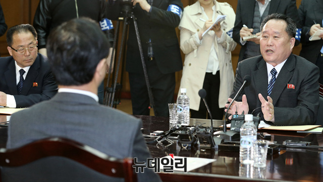 북한 리선권이 29일 오전 판문점 북측 통일각에서 열린 남북 고위급회담에 참석해 발언하고 있다. (사진=공동취재단)