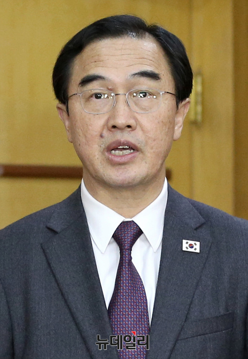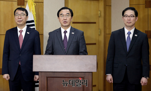 조명균 통일부 장관이 29일 오전 판문점 북측 통일각에서 열린 남북 고위급회담을 마친 후 브리핑하고 있다. (사진=공동취재단)
