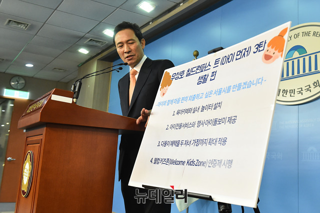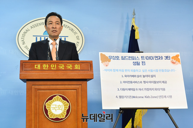 서울시장 출마를 선언한 우상호 더불어민주당 의원이 30일 오전 국회 정론관에서 칠드런 퍼스트 (아이 먼저) 정책공약을 발표하고 있다.