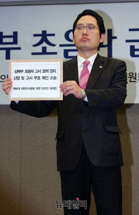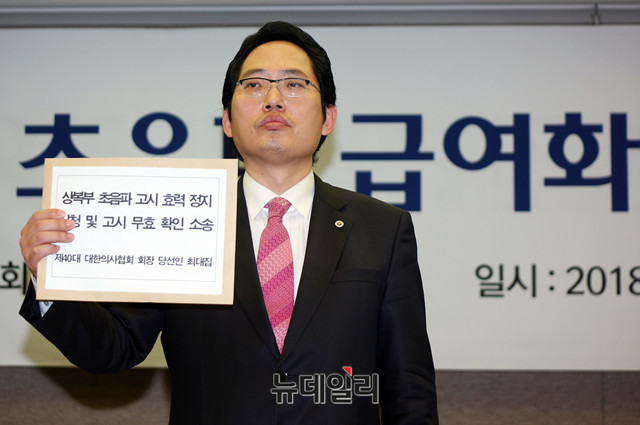 최대집 대한의사협회 회장 당선인이 30일 오전 서울 중구 한국프레스센터에서 '상복부 초음파 급여화 관련 긴급 기자회견'을 열고 '상복부 초음파 고시 효력 정지 신청 및 고시 무효 소송' 가처분 신청서를 들고 있다.