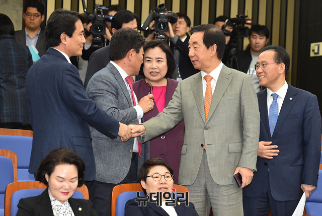 김성태 자유한국당 원내대표가 30일 오후 국회에서 열린 의원총회에서 동료의원들과 인사를 나누고 있다.