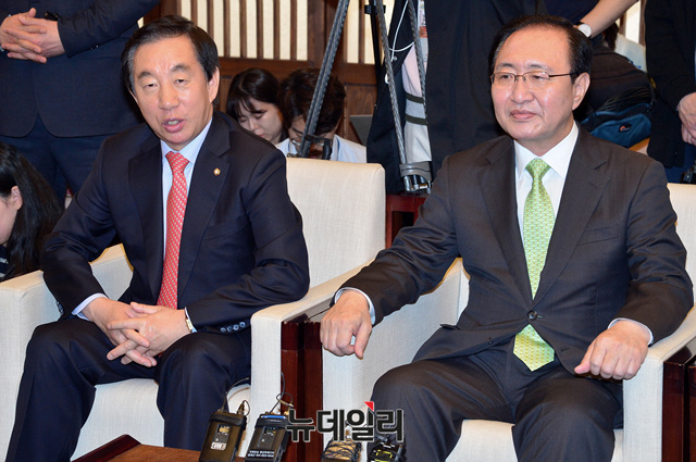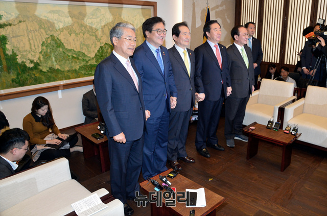 정세균 국회의장과 우원식 더불어민주당, 김성태 자유한국당, 김동철 바른미래당, 노희찬 정의당 원내대표가 2일 오전 국회의장실에서 열린 교섭단체 원내대표단 정례회동에 앞서 기념촬영을 하고 있다.