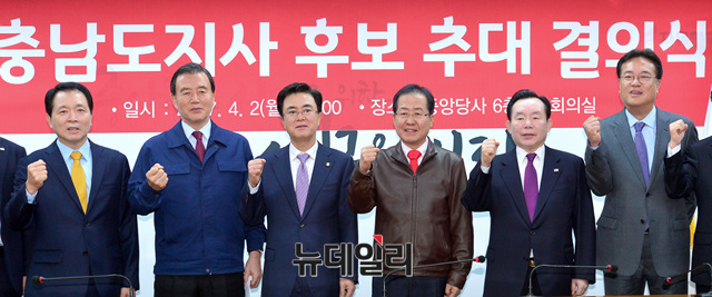 홍준표 자유한국당 대표와 이인제 전 최고위원이 2일 오전 서울 여의도 자유한국당 중앙당사에서 열린 충남도지사 후보 추대 결의식에 참석해 화이팅을 외치고 있다.