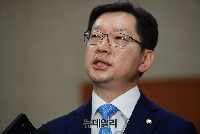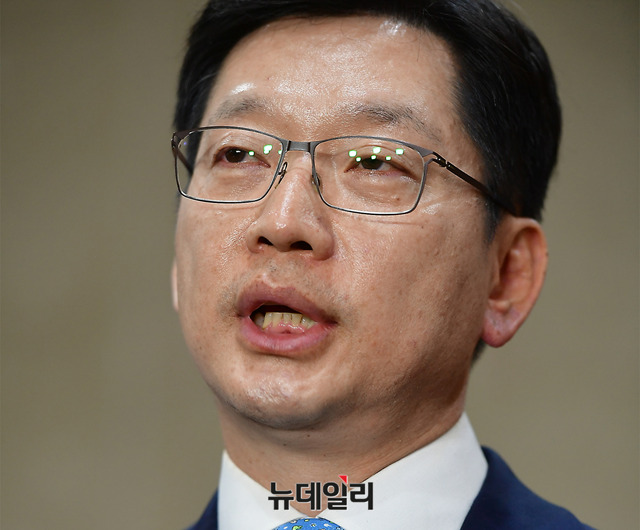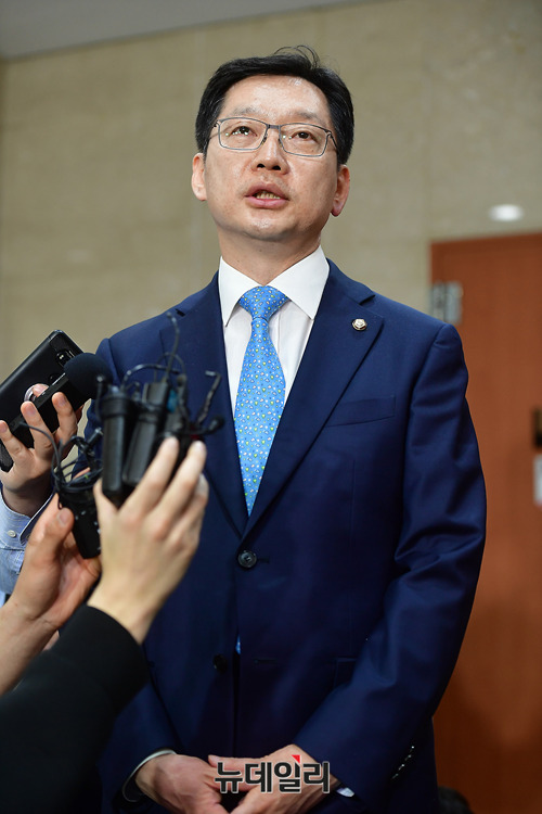 김경수 더불어민주당 의원이 2일 오후 국회 기자회견장에서 6월 지방선거 경남도지사 출마 선언 직후 취재진들의 질문에 답하고 있다. 더불어민주당은 앞서 공민배, 공윤권, 권민호 경남도지사 예비후보를 초청해 간담회를 갖고 김 의원을 도지사 후보로 추대하기로 했다고 밝혔다.