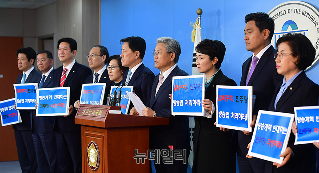 김동철 바른미래당 원내대표를 비롯한 의원들이 2일 오후 국회 정론관에서 방송법 처리 촉구 및 여당의 오만함을 규탄하는 기자회견을 갖고 있다. (오른쪽부터 하태경 최고위원, 지상욱 정책위의장, 최도자 의원, 오신환 원내수석부대표, 이언주 의원, 김 원내대표, 주승용, 김삼화, 오세정, 이동섭, 이찬열 의원, 유의동 대변인)