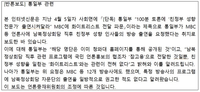 한편, 통일부는 "'2018 남북정상회담'과 관련, 언론사의 취재홍보 협의 과정에서 '2018 남북정상회담' 자문단 46명(원로 21명, 전문가 25명) 명단을 MBC 등 12개 방송사에 참고자료로 전달한 바 있다"면서 "상기 자문단 명단은 이미 청와대 홈페이지를 통해 공개된 것으로, 이는 일명 '화이트리스트'와는 성격이 전혀 다르며 상기 언론(뉴데일리) 보도는 대국민 언론홍보 협조의 취지를 왜곡한 측면이 있다는 것을 알려드린다"고 해명했다.
