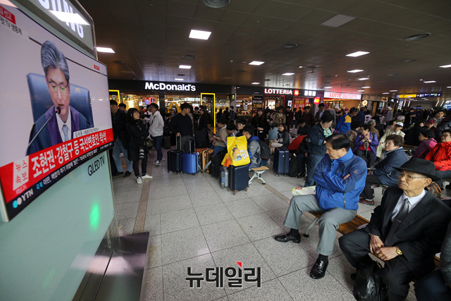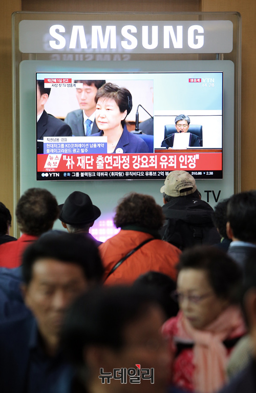 시민들이 6일 오후 서울역 대합실에서 박근혜 전 대통령의 1심 공판 중계를 보고 있다.