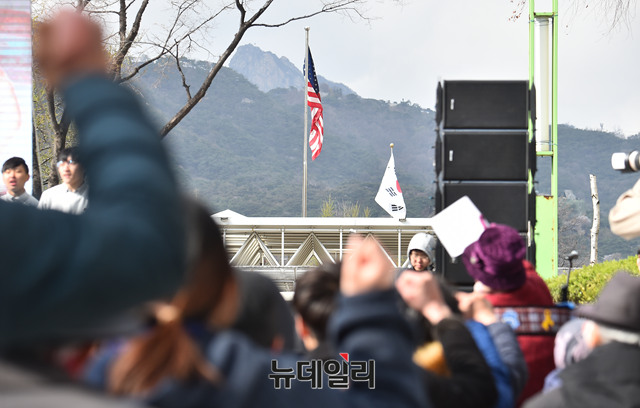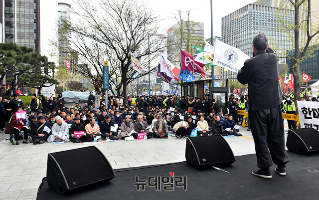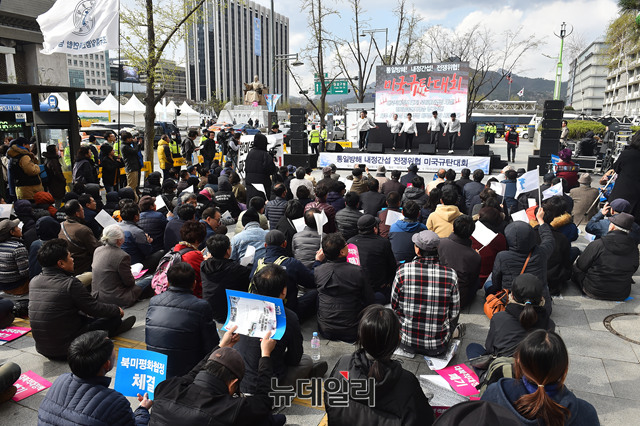 4.7미국 규탄대회 준비모임과 제주4.3 70주년 기념사업회가 7일 오후 서울 광화문 케이티 사옥 앞에서 '대북적대정책 폐기, 북미평화협정 체결, 한미합동군사연습 영구중단, 제주4.3학살 주범 미국은 즉각 사과하라'를 주제로 집회를 갖고 있다.
