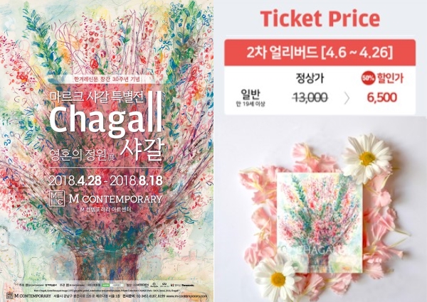 '마르크 샤갈 특별전 – 영혼의 정원展'이 2차 얼리버드 티켓을 오픈한다.지난달 전시입장권과 도록으로 구성된 1차 얼리버드 패키지 티켓을 선보인 '마르크 샤갈 특별전'은 전시-얼리버드티켓 분야 판매 1순위를 기록하며 인기리에 1차 판매를 종료했다.이에 힘입어 일반 전시 관람권(1만3000원)을 정상가 50% 할인된 6500원으로 구입할 수 있는 2차 얼리버드 티켓을 오는 26일까지 판매한다.'마르크 샤갈 특별전'은 국내에서 개최된 샤갈의 전시 중 가장 많은 작품을 만날 수 있으며 프랑스, 스위스, 스페인, 이탈리아 등 유럽 4개국의 개인 컬렉터들의 소장품으로 구성된다.이 중 국내 최초로 공개되는 작품은 총 25점이다. 관람객들은 샤갈(1887 – 1985)의 폭넓은 작품 세계를 조망할 수 있는 엄선된 260여점을 통해 지금까지 보지 못했던 색다른 그의 인생전을 경험할 수 있다.'마르크 샤갈 특별전 – 영혼의 정원展'의 2차 얼리버드 티켓은 인터파크티켓, 티몬, 네이버예매 통해 구매할 수 있다. 해당 티켓 전시관람권은 4월 28일 공식개막일부터 5월 20일까지 사용 가능하다.[사진=M컨템포러리]