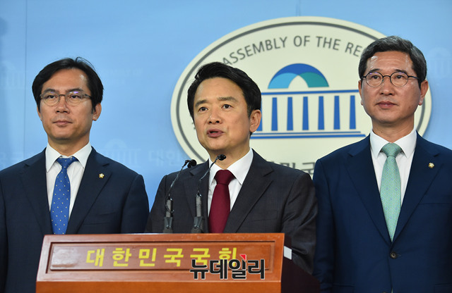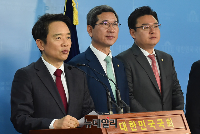 남경필 경기도지사가 9일 오전 국회 정론관에서 '지역특구법 폐지 및 수도권 규제 혁신 촉구' 성명을 발표하고 있다. 이날 기자회견에는 자유한국당 이현재, 김영우, 김학용, 이현재, 김성원 의원 등이 참석했다.