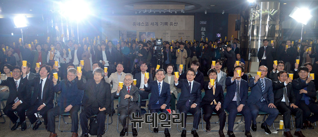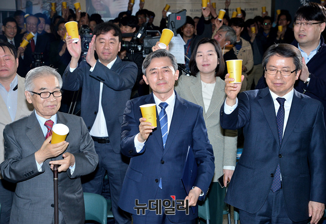 양승동 KBS 신임 사장이 9일 오전 서울 KBS본관 시청자광장에서 열린 취임식에 참석해 '2018년 4월, 오래 기다린 봄' 이라고 적힌 노란색 종이컵을 들고 구호를 외치고 있다.