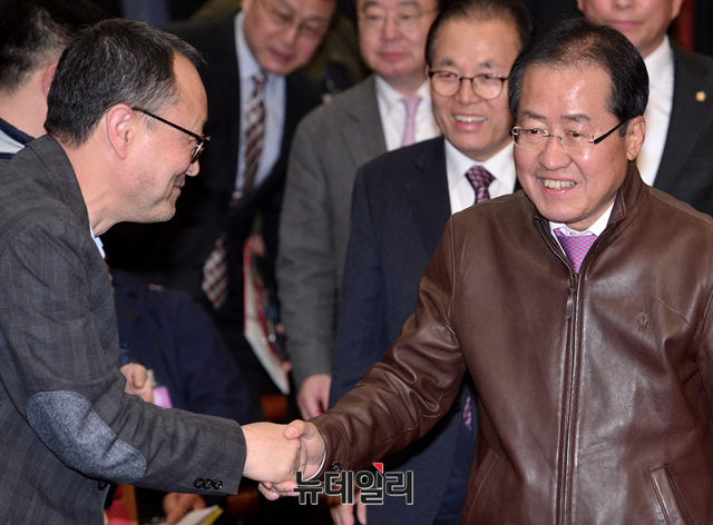 홍준표 자유한국당 대표가 9일 오후 국회 의원회관에서 열린 '소상공인 지원과 자립을 위한 국회 대토론회'에 참석해 악수를 나누고 있다.