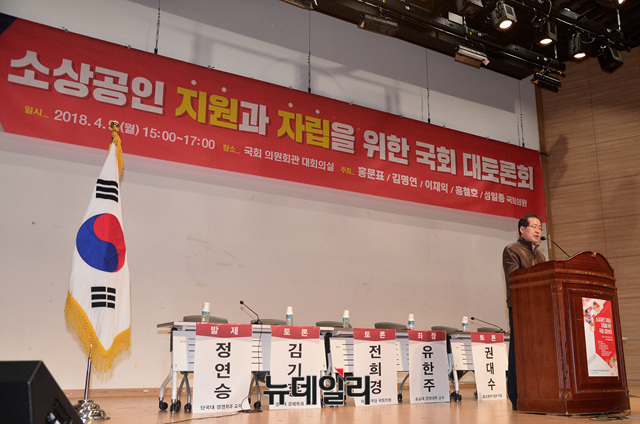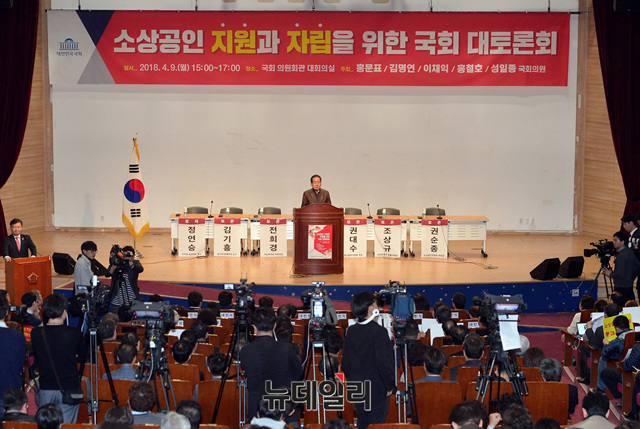 홍준표 자유한국당 대표가 9일 오후 국회 의원회관에서 열린 '소상공인 지원과 자립을 위한 국회 대토론회'에 참석해 축사를 하고 있다.