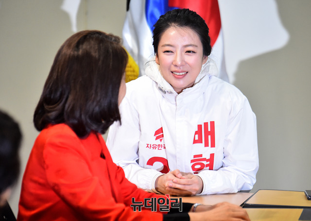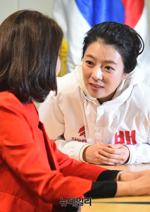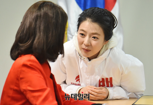 나경원 자유한국당 의원과 배현진 송파을 당협위원장이 10일 오전 서울 여의도 자유한국당 중앙당사에서 열린 서울-세종시장 후보 추대 결의식에서 대화를 나누고 있다.