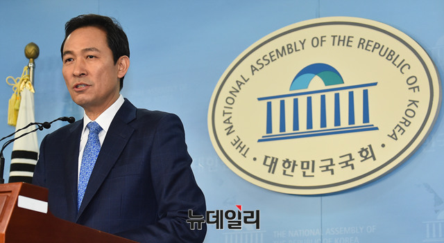 더불어민주당 서울시장 예비후보인 우상호 의원이 10일 오전 국회 정론관에서 서울자치정부 추진과 비젼 발표 기자회견을 하고 있다.