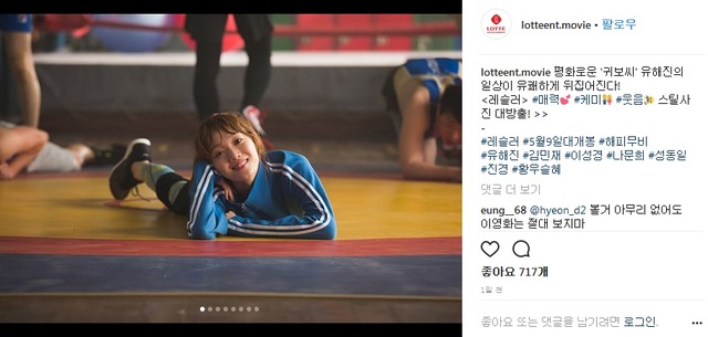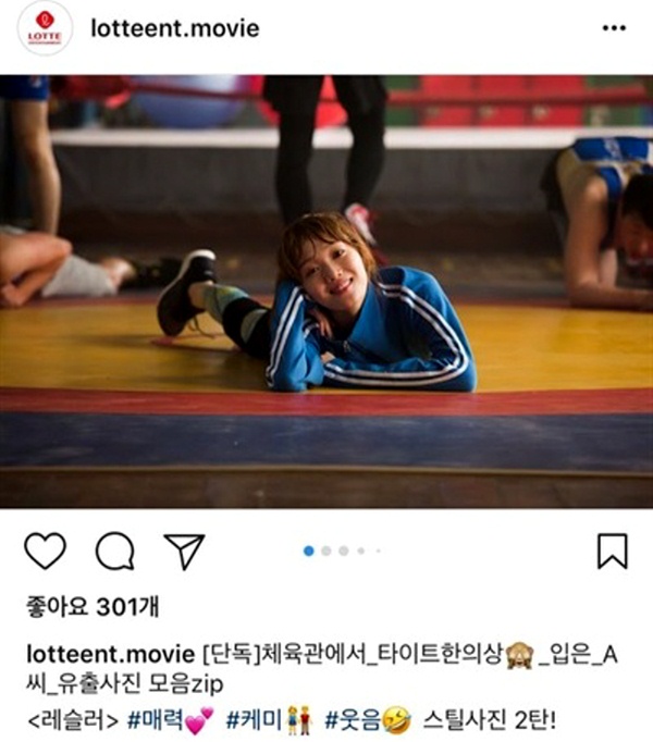 지난 9일 롯데엔터테인먼트는 공식 인스타그램에 영화 '레슬러'의 스틸 컷을 올린 뒤 『[단독] 체육관에서_타이트한의상_입은_A씨_유출사진_모음.zip』이라는 설명을 달았다.