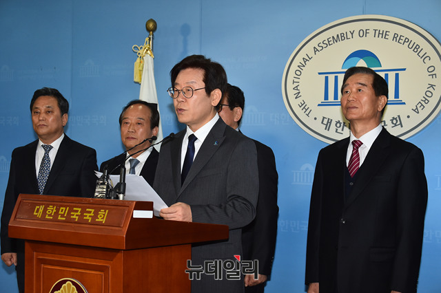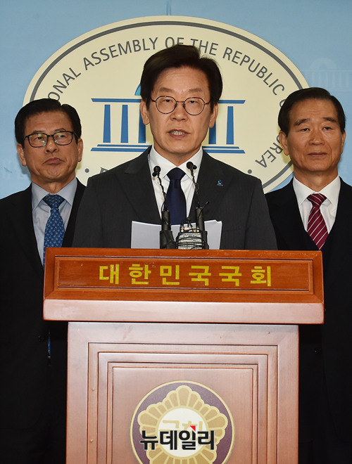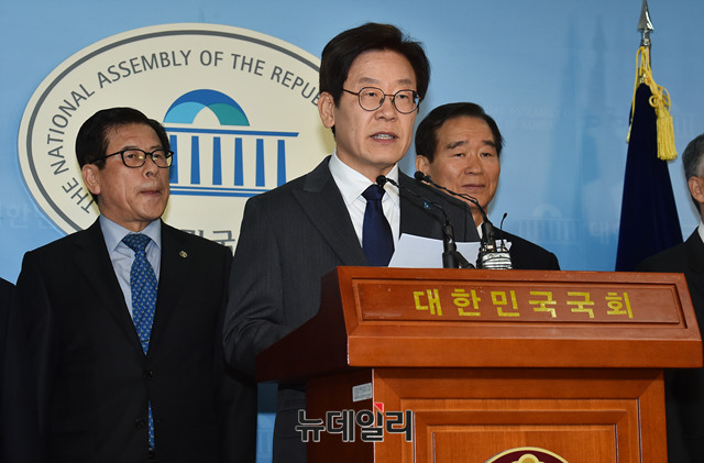 6.13 지방선거에서 경기도지사에 출마한 이재명 더불어민주당 예비후보가 11일 오전 국회 정론관에서 통일외교안보 정책을 발표하고 있다.