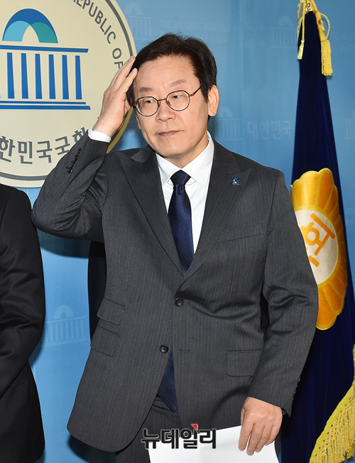 6.13 지방선거에서 경기도지사에 출마한 이재명 더불어민주당 예비후보가 11일 오전 국회 정론관에서 통일외교안보 정책을 발표 후 회견장을 떠나고 있다.