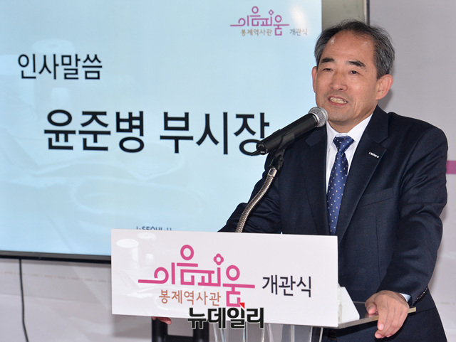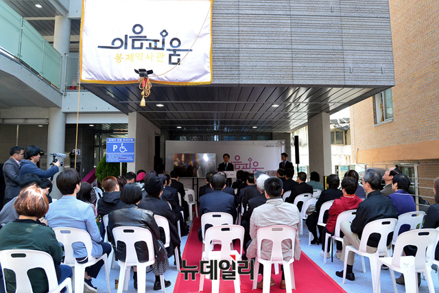 윤준병 서울시 행정1부시장, 김영종 종로구청장 등 관계자들이 11일 오전 서울 종로구 창신동 봉제역사관 '이음피움'에서 개관을 알리는 현판식을 하고 있다.