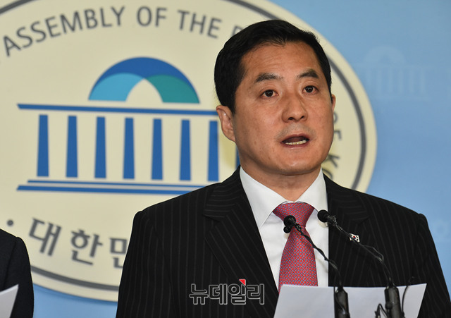 과학기술정보방송통신위원회 소속 자유한국당 박대출-김성태 의원이 11일 오전 국회 정론관에서 방송법 관련 기자회견을 하고 있다.