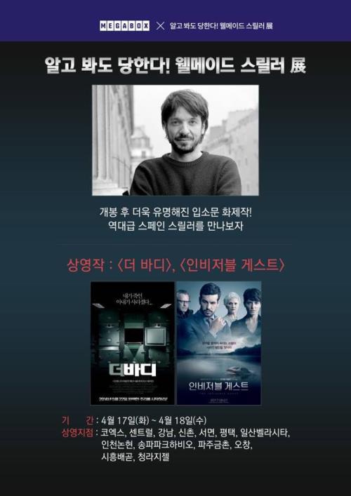 멀티플렉스 영화관 메가박가 '웰메이드 스릴러' 기획전을 진행한다.이번 기획전에서는 스페인 출신의 신예 천재 감독 오리올 파울로의 대표작인 '더 바디'와 '인비저블 게스트'를 오는 17일과 18일 양일간 상영할 예정이다.오리올 파울로 감독은 이 두 편의 영화로 "길예르모 델 토로 감독의 후계자", "스페인의 데이빗 핀처"로 불리며 관객과 평단을 비롯해 유수의 영화제에서 연출력을 인정받았다.또, '식스센스'와 '유주얼 서스펙트'를 능가하는 영화라는 평을 받았으며, 국내 영화 제작자들이 높은 관심을 보이며 리메이크를 하기도 했다.'더 바디'는 최근 개봉해 130만 명의 관객을 동원한 국내 영화 '사라진 밤'의 원작이다. 스타일리시한 연출과 놀라운 반전으로 관객들의 호평을 받은 작품이다.'인비저블 게스트'는 연인 로라를 죽인 용의자로 지목된 아드리안이 단 3시간 안에 자신의 무죄를 밝히는 과정에서 예상치 못한 진실을 알게 되는 스릴러물이다. '광해, 왕이 된 남자', '신과 함께'의 제작사인 리얼라이즈픽쳐스에서 리메이크를 준비하고 있다.[사진=메가박스]