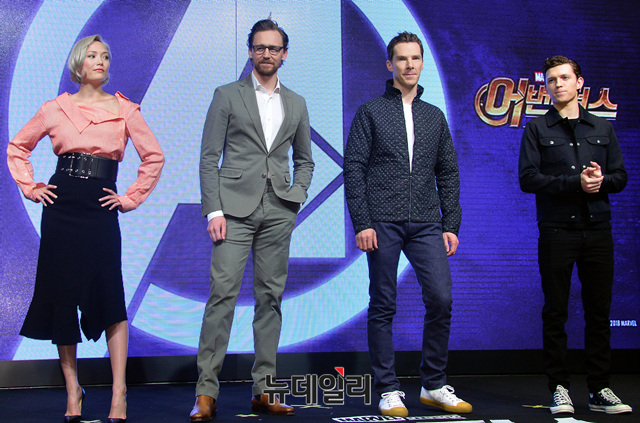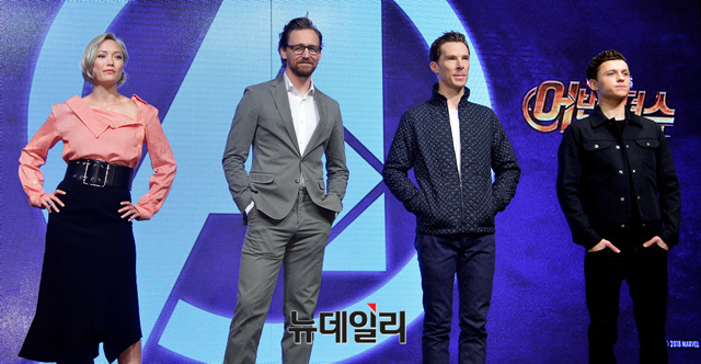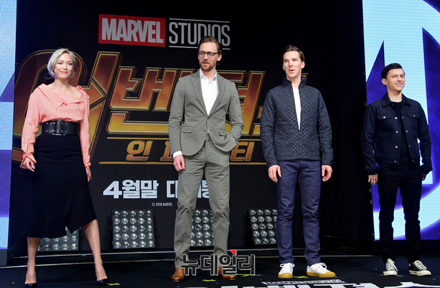 영화 '어벤져스: 인피니티워(Avengers: Infinity War)'의 배우들(베네딕트 컴버배치, 톰 히들스턴, 톰 홀랜드, 폼 클레멘티에프)이 12일 오전 서울 종로구 포시즌호텔에서 열린 내한 기자간담회에 참석해 포즈를 취하고 있다.'어벤져스 : 인피니트워'는 우주를 관장할 수 있는 힘을 가진 인피니티스톤을 모아 우주를 장악하려는 빌런 타노스와 그를 막으려는 새로운 조합의 어벤져스가 대결을 펼치는 이야기를 담았다. 오는 25일 개봉 예정이다.