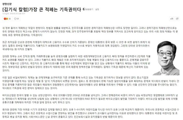 지난 1월30일자 <경향신문>에 실린 김기식 칼럼을 보자. 자신의 이름까지 문패에 달아낸 '가장 큰 적폐는 기득권이다'는 글이다.시작부터 끝까지 '기득권을 혁파해야 혁신이 성공한다'는 내용이다. '기득권=적폐'라는 명제를 대입하는데 여념이 없다.직불카드 확대를 반대하는 카드사를 수수료에 눈먼 악덕회사로 비판했다.편의점에서 파는 일반의약품을 늘리는 것을 저지하는 약사회를 기득권으로 몰아붙였다. 거창한 바이오산업 성장까지 언급하며 '약사회란 기득권 앞에 유통구조 개혁은 엄무도 내지 못하고 있다'고 지적했다.맞벌이 부부를 위한 유치원·초등학교 수업시간 늘리기에 반발하는 교사들을 단지 업무시간이 느는 걸 단지 '싫어하는 것'으로 표현했다.다 맞는말이다. 그렇다면 김기식 스스로 내놓은 해결법을 들여다 보자.기득권 세력은 자신의 기득권을 포기하거나 양보할 생각이 없다고 했다. 그래서 기득권을 혁파 해야 한다고 주장한다. 특히 정치적인 기득권 혁파는 반발이 격렬함으로 국민이 체감할 수 있는 일부터 전략적으로 해야 한다고 했다.돌아와 오늘에는 김기식 금융감독위원장이 석달 전 자신이 쓴 칼럼을 다시 읽어야 할 때다.국회의원이란 가장 강력한 기득권을 쥐고 피감기관을 흔들었다. 그들의 돈으로 출장도 다니고, 후원금도 받고, 강좌도 운영했다. '할 수 있는 갑질은 다했다'는 지적이 남의 얘기가 아니다.여론은 계속 돌아서고 있는데 사퇴는 끝끝내 거부하고 있다. 12일자 여론조사를 보면 김기식 원장이 사퇴해야 한다는 50.5%로 절반을 넘었다.그가 당당히 적어낸 '국민이 체감할 수 있는 기득권 혁파'가 무엇을 말하는지, 이제는 스스로 생각해봐야 할 때다.<인용 여론조사는 TBS 의뢰로 리얼미터가 11일 하루 전국 성인 500명을 상대로 한 설문. 95% 신뢰 수준에 표본오차 ±4.4%포인트. 자세한 조사개요와 결과는 리얼미터 홈페이지 혹은 중앙선거여론조사심의위원회 홈페이지를 참고하면 된다.>