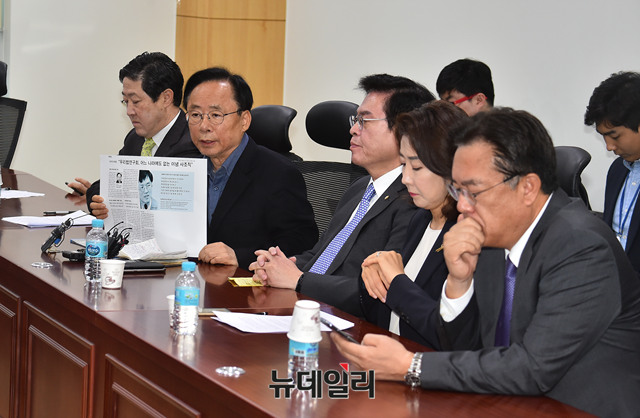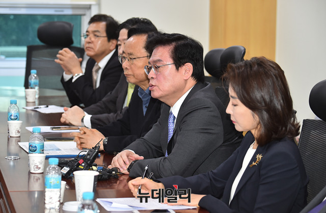 자유한국당 심재철, 유기준, 이주영, 정우택, 나경원 , 정진석 의원이 12일 오전 국회 의원회관에서 당 중진의원 모임에 참석해 의견을 나누고 있다.