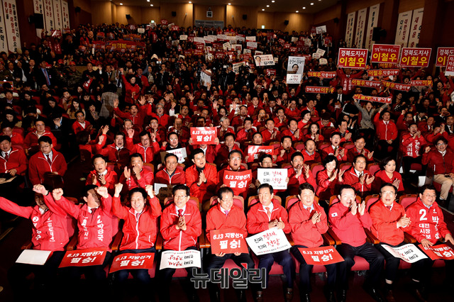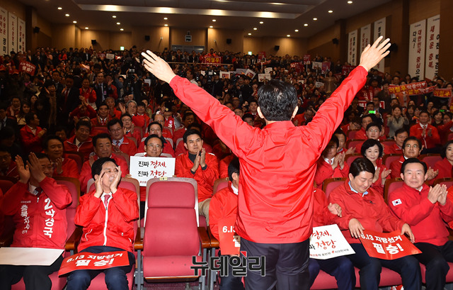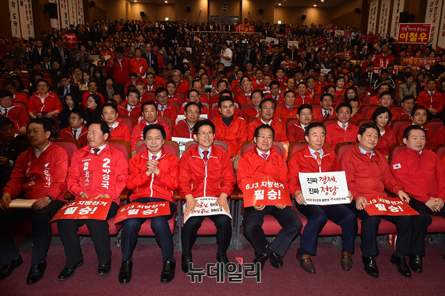자유한국당 지방선거 후보자 출정식이 12일 오전 국회 의원회관에서 열린 가운데 홍준표 당대표와 김성태 원내대표, 김문수 서울시장 후보를 비롯한 후보들과 소속의원들이 박수를 치고 있다.