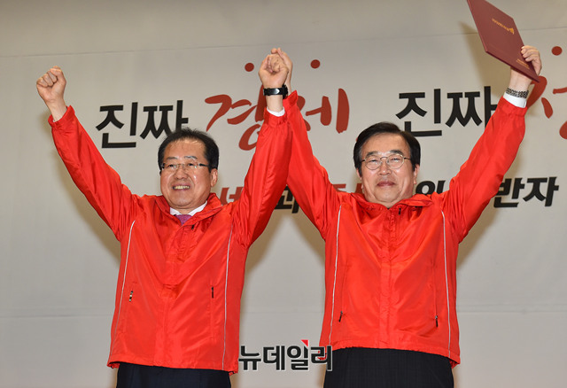 자유한국당 지방선거 후보자 출정식 12일 오전 국회 의원회관에서 열린 가운데 홍준표 대표가 서병수 부산시장 후보에게 공천장을 수여하고 있다.