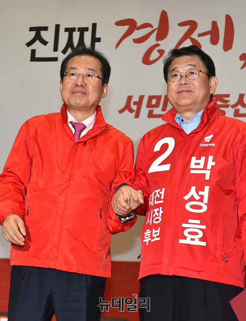 자유한국당 지방선거 후보자 출정식이 12일 오전 국회 의원회관에서 열린 가운데 홍준표 대표가 박성효 대전시장 후보에게 공천장을 수여하고 있다.