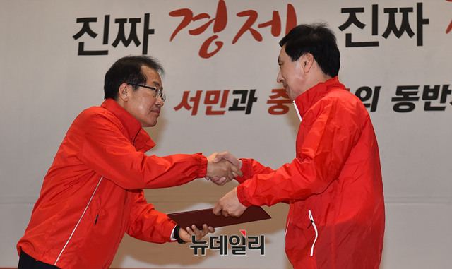 자유한국당 지방선거 후보자 출정식이 12일 오전 국회 의원회관에서 열린 가운데 홍준표 대표가 김기현 울산시장 후보에게 공천장을 수여하고 있다.