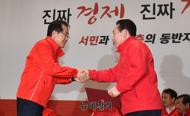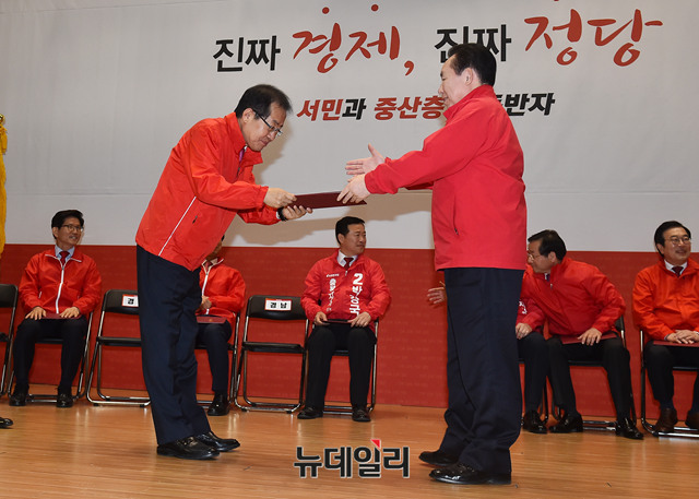 자유한국당 지방선거 후보자 출정식이 12일 오전 국회 의원회관에서 열린 가운데 홍준표 대표가 이인제 충남지사 후보에게 공천장을 수여하고 있다.