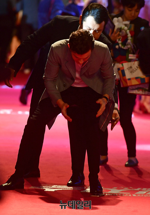 헐리우드 배우 톰 홀랜드가 12일 오후 서울 강남구 코엑스 동쪽광장에서 열린 영화 '어벤져스: 인피니티워(Avengers: Infinity War)' 내한 레드카펫 행사에서 팬이 건넨 휴대폰을 떨어뜨리자 난감해 하고 있다.