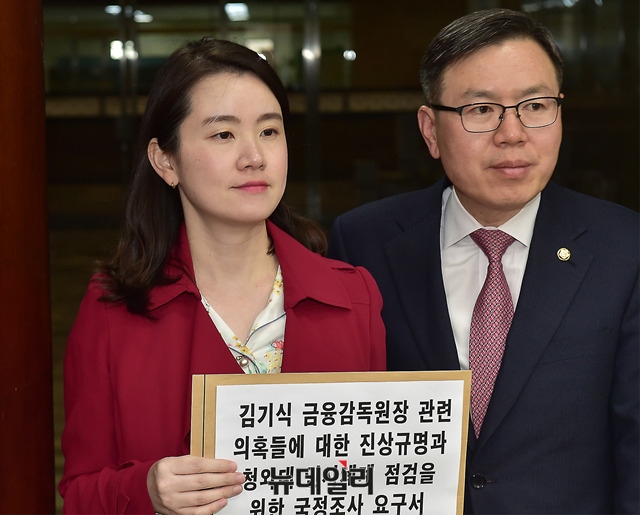 신보라 자유한국당 원내대변인과 정태옥 대변인(왼쪽부터)이 13일 오후 국회 의안과에 김기식 금융감독원장 관련 의혹들에 대한 진상규명과 청와대 인사체계 점검을 위한 국정조사 요구서를 제출하기 위해 입장하과 있다.