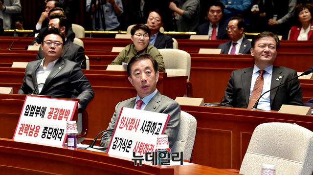 자유한국당 의원총회가 13일 오후 국회에서 열린 가운데 김성태 원내대표와 소속 의원들이 김기식 금융감독원장을 규탄하는 영상을 시청하고 있다.