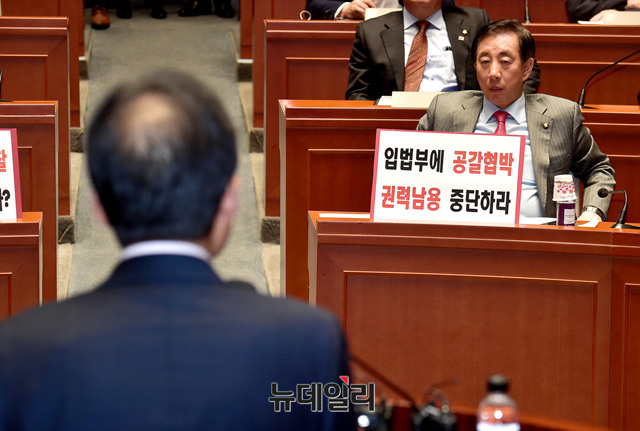 자유한국당 의원총회가 13일 오후 국회에서 열린 가운데 홍준표 대표가 청와대 영수회담 결과를 설명하고 있는 모습을 김성태 원내대표가 바라보고 있다.