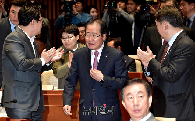 자유한국당 의원총회가 13일 오후 국회에서 열린 가운데 홍준표 대표가 청와대 영수회담을 마치고 입장하고 있다.