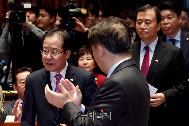 [포토] 영수회담 마치고 의총장으로 들어서는 홍준표 대표