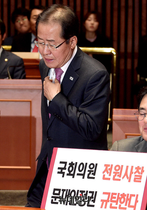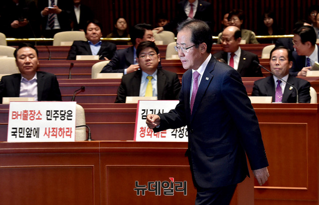자유한국당 의원총회가 13일 오후 국회에서 열린 가운데 홍준표 대표가 청와대 영수회담 결과를 설명하기 위해 단상으로 향하고 있다.