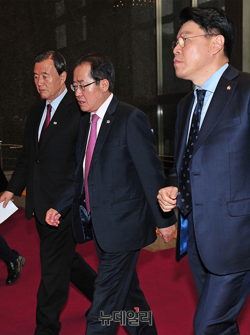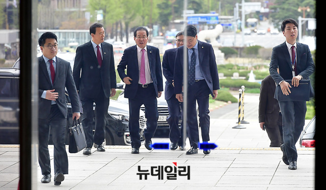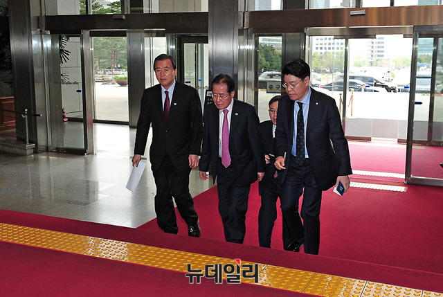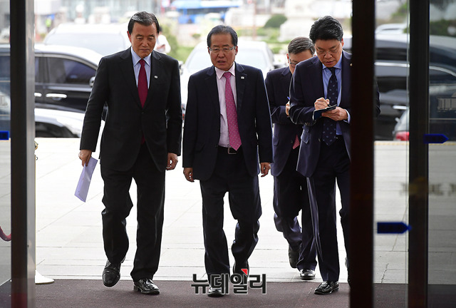 홍준표 자유한국당 대표가 13일 오후 문재인 대통령과 단독 회담을 마친 직후 의원총회에 참석하기 위해 국회로 들어서고 있다.