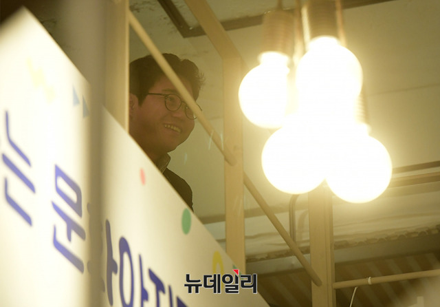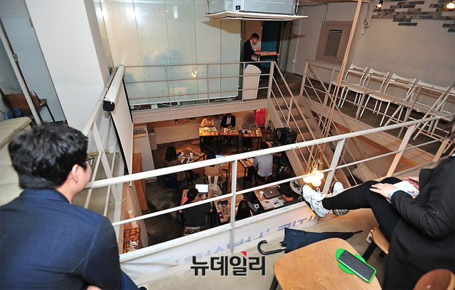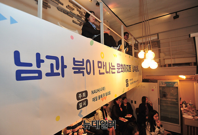 지성호 NAUH 대표가 14일 오전 서울 서대문구의 한 카페에서 열린 남북청년들의 토론회인 '2018 남북살롱'에 참석해 토론을 지켜보고 있다. 지성호 대표는 지난 1월 미국 워싱턴DC에서 열린 도널드 트럼프 미국 대통령 연두교서 발표장에서 소개된 인물이다.북한인권단체 NAUH(나우:Now Action Unity for Human rights)가 주최한 이번 토론회는 남북한의 문화를 이해하고 남북한 주민들의 이질감을 해소하기 위해 마련됐다.토론회의 사회는 탈북민 김필주(32·가톨릭대)씨가 맡았다. 최수지 통일대학생동아리연합 대표와 탈북민 A씨가 토론자로 나서 남북한의 연애에 대해 토론했다.