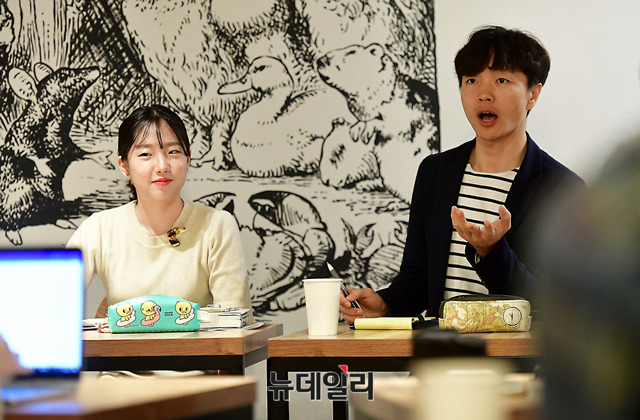 남북청년들의 토론회인 남북살롱이 14일 오전 서울 서대문구의 한 카페에서 '연애의 온도'를 주제로 열린 가운데 탈북민 A씨가 발언하고 있다.이날 토론회의 사회는 탈북민 김필주(32·가톨릭대)씨가 맡았다. 최수지 통일대학생동아리연합 대표와 탈북민 A씨가 토론자로 나서 남북한의 연애에 대해 토론했다.북한인권단체 NAUH(나우:Now Action Unity for Human rights)가 주최한 이번 토론회는 남북한의 문화를 이해하고 남북한 주민들의 이질감을 해소하기 위해 마련됐다.