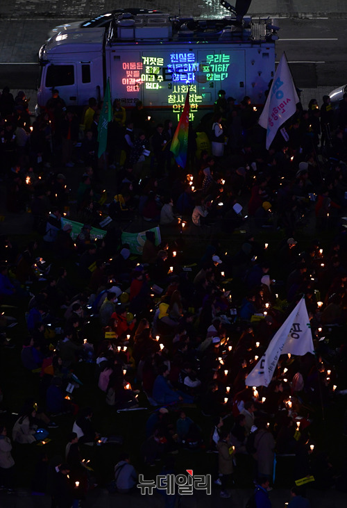 세월호 사고 4주기를 앞둔 14일 오후 서울 광화문 북측광장에서 진행된 세월호 사고 4주기 추모행사에서 참가자들이 KBS 중계방송 차량을 배경으로 세월호 관련 레이저 포인트 글귀를 쏘고 있다.