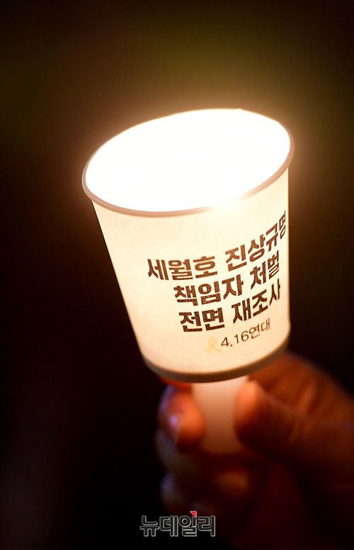 세월호 4주기를 앞둔 14일 오후 서울 광화문 북측광장에서 진행된 세월호 사고 4주기 추모행사에서 한 참가자가 진상규명을 요구하는 글귀가 적힌 촛불을 들고 있다.