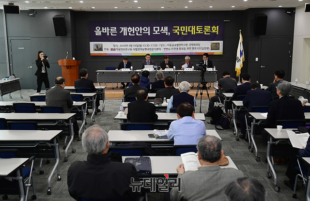 고영일 바른개헌국민연합 운영위원장이 16일 오후 서울 종로구 서울글로벌센터 국제회의장에서 열린 '올바른 개헌안의 모색, 국민대토론회'에서 '대통령 개헌안에 대한 기독교적 관점에서의 문제점 분석'을 주제로 발표하고 있다.