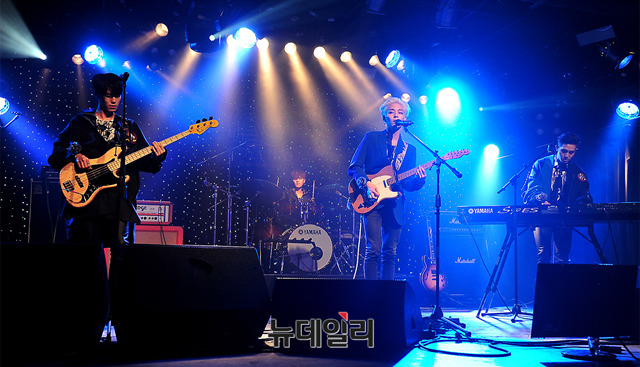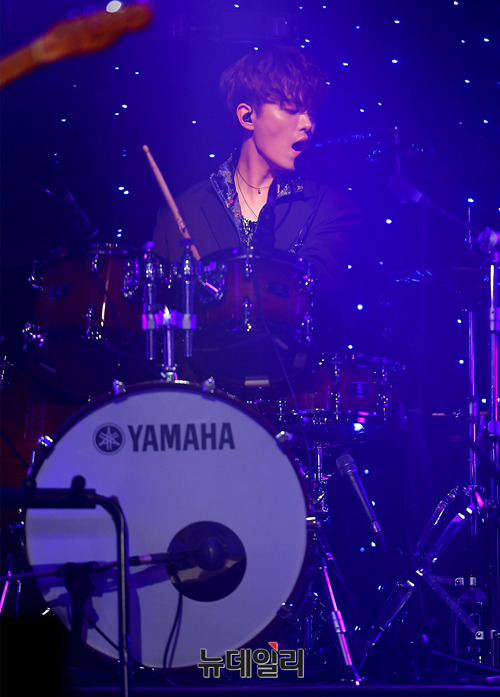 4인조 밴드 '더 로즈(The Rose)'의 드럼을 맡은 하준이 16일 오후 서울 마포구 홍대 롤링홀에서 열린 첫 미니 앨범 'Void(보이드)' 컴백 쇼케이스에서 수록곡 무대를 선보이고 있다.