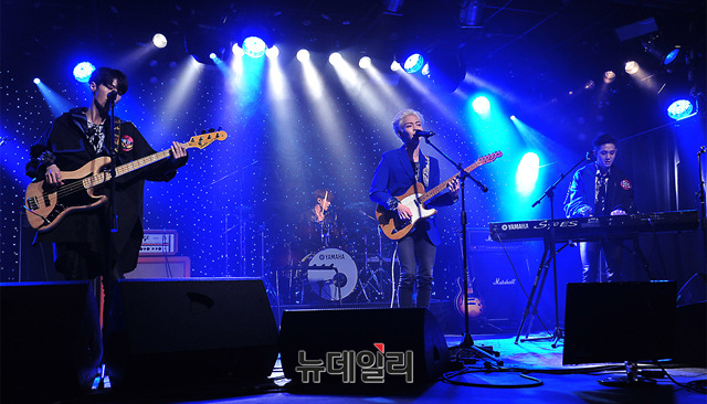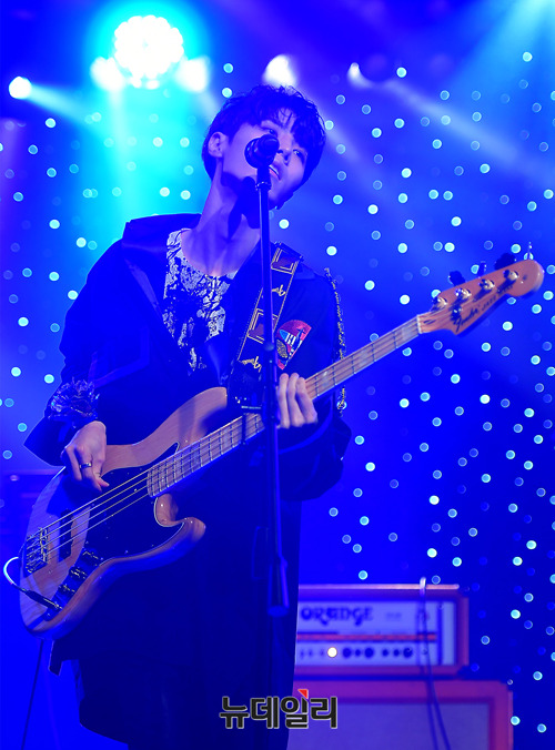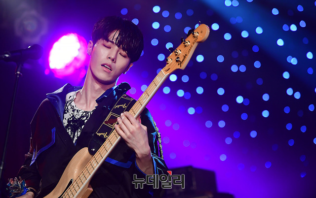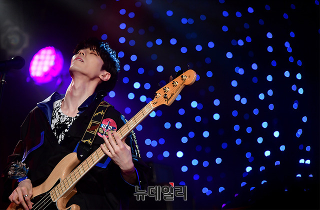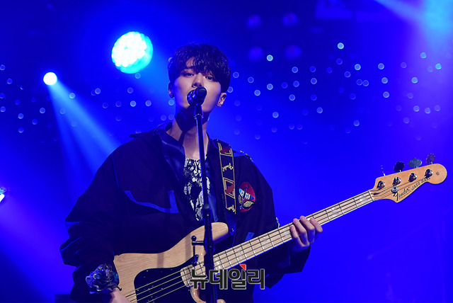 4인조 밴드 '더 로즈(The Rose)'의 베이스를 맡은 재형이 16일 오후 서울 마포구 홍대 롤링홀에서 열린 첫 미니 앨범 'Void(보이드)' 컴백 쇼케이스에서 수록곡 무대를 선보이고 있다.