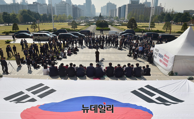 김성태 자유한국당 원내대표 등 소속의원들이 18일 오전 국회 본청 계단 앞 천막 농성장에서 열린 의원총회에서 규탄구호를 외치고 있다.
